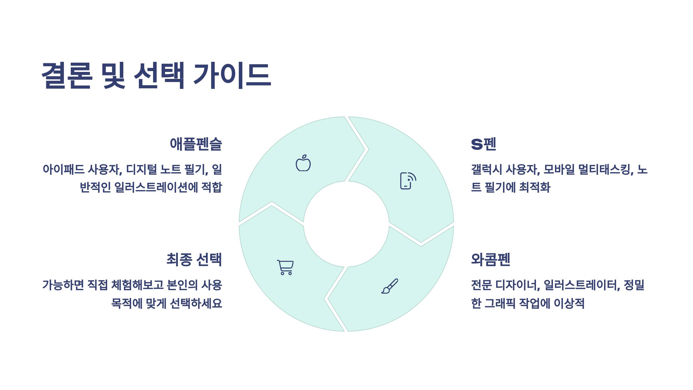📌 각 펜은 분명한 개성과 강점을 가지고 있어요. 애플펜슬은 섬세한 드로잉과 노트 앱 생태계에서 최강, S펜은 편리한 필기와 기능성에서 최고, 와콤펜은 프로급 작업에서 독보적이죠.