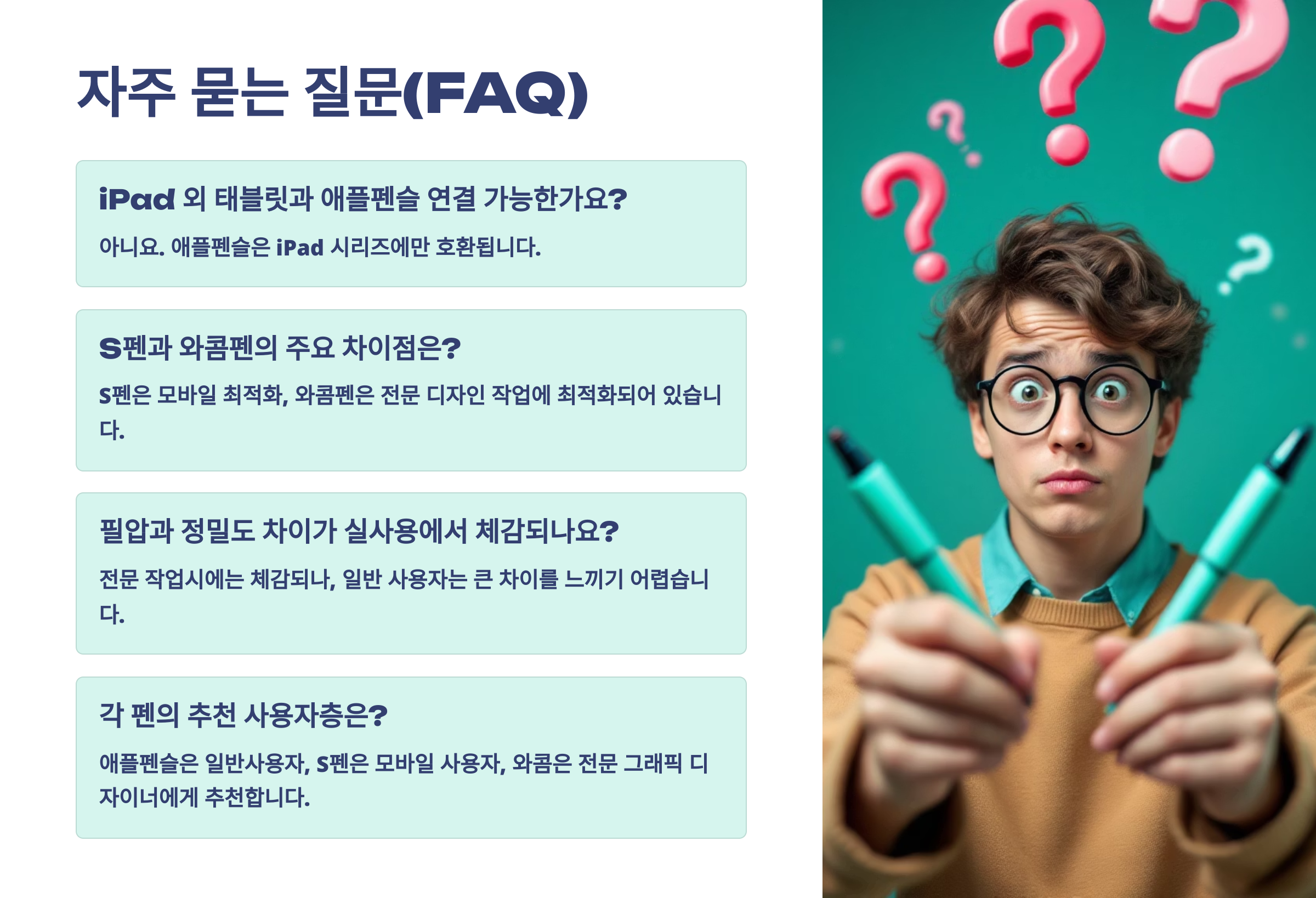 💬 애플펜슬은 iPad 전용, S펜은 삼성 갤럭시 전용, 와콤은 별도 태블릿이 필요해요. 내가 쓰는 기기에서 인식 가능한 펜인가? 이거부터 확인하세요!
