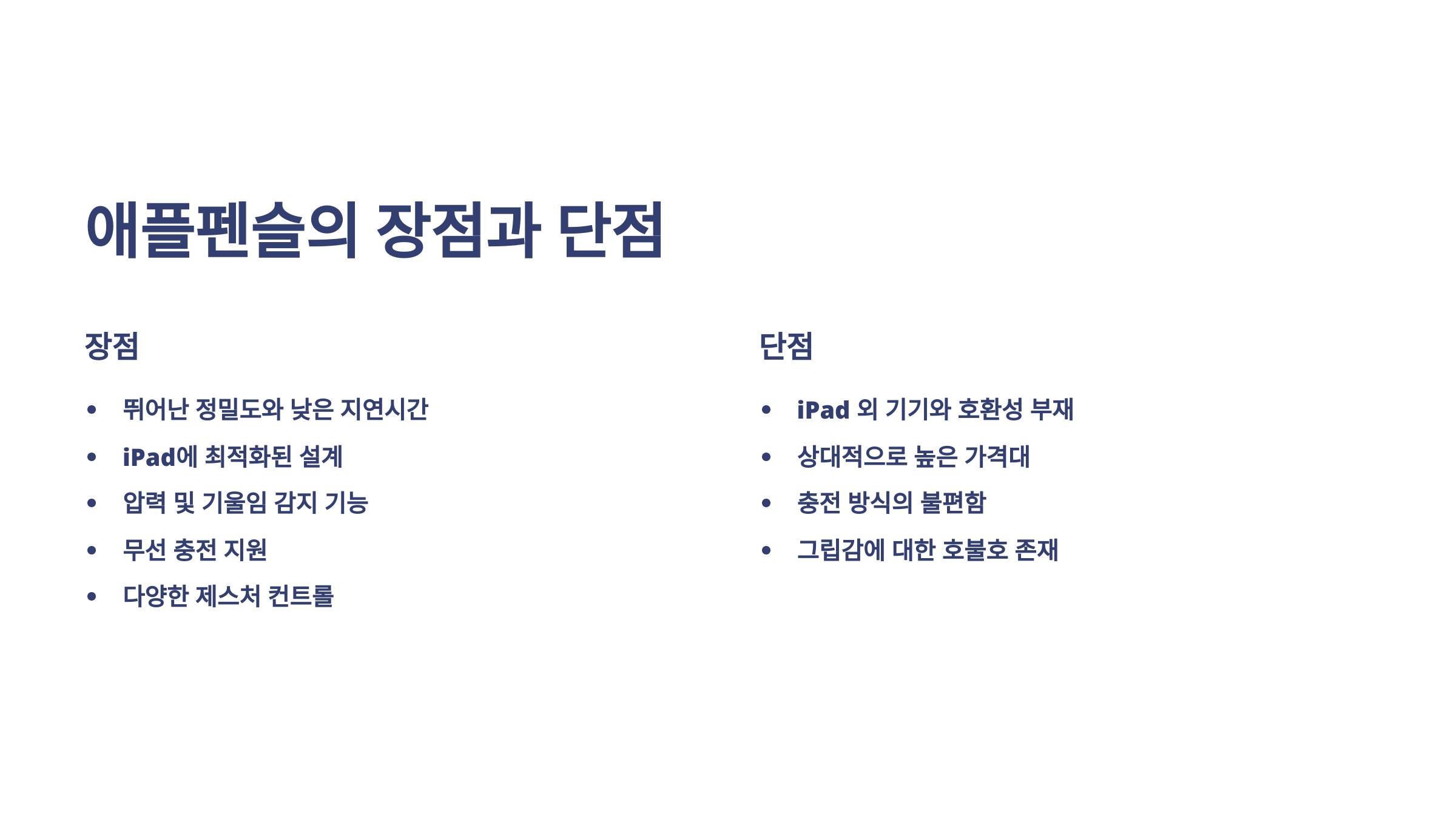 🔋 다만 단점은 가격이 높고, 호환 기기 제한이 있다는 거예요. iPad가 없으면 사용할 수 없고, 심지어 같은 아이패드여도 세대에 따라 호환이 안 되는 경우도 있어요. 예: 1세대 vs 2세대 호환 불가!