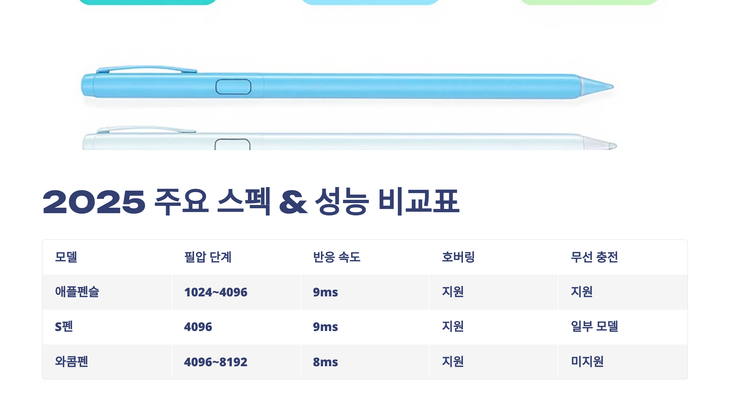 🔍 지금까지는 각각의 펜의 특징을 따로 살펴봤다면, 이제는 한눈에 비교할 차례예요! 아래 표에서는 애플펜슬, S펜, 와콤펜의 주요 사양과 기능, 강점 등을 객관적으로 정리해봤어요. 어떤 펜이 나에게 맞는지 바로 판단할 수 있을 거예요! 😉