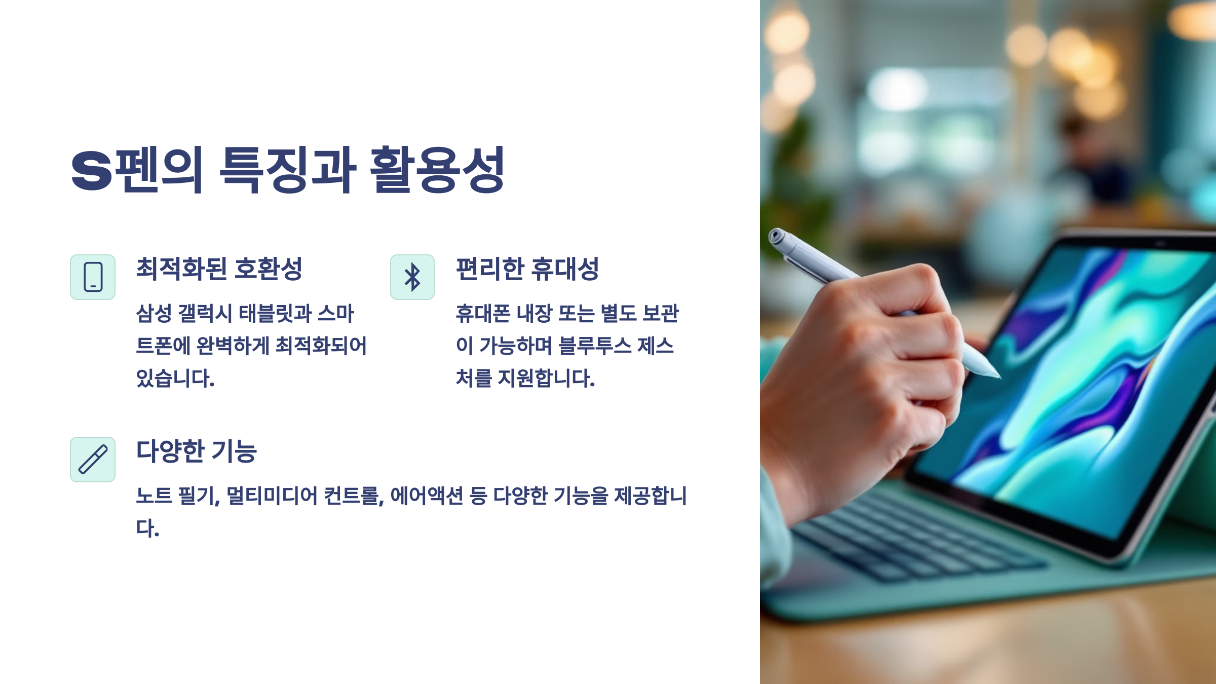📱 삼성의 S펜은 갤럭시 탭 시리즈, S 울트라 라인업, 갤럭시 노트 시리즈에 탑재되는 대표적인 디지털 펜이에요. 무선 충전이 필요 없고, 기기 안에 삽입 보관이 가능하다는 점이 가장 큰 장점이에요. 분실 걱정이 적죠! 💼