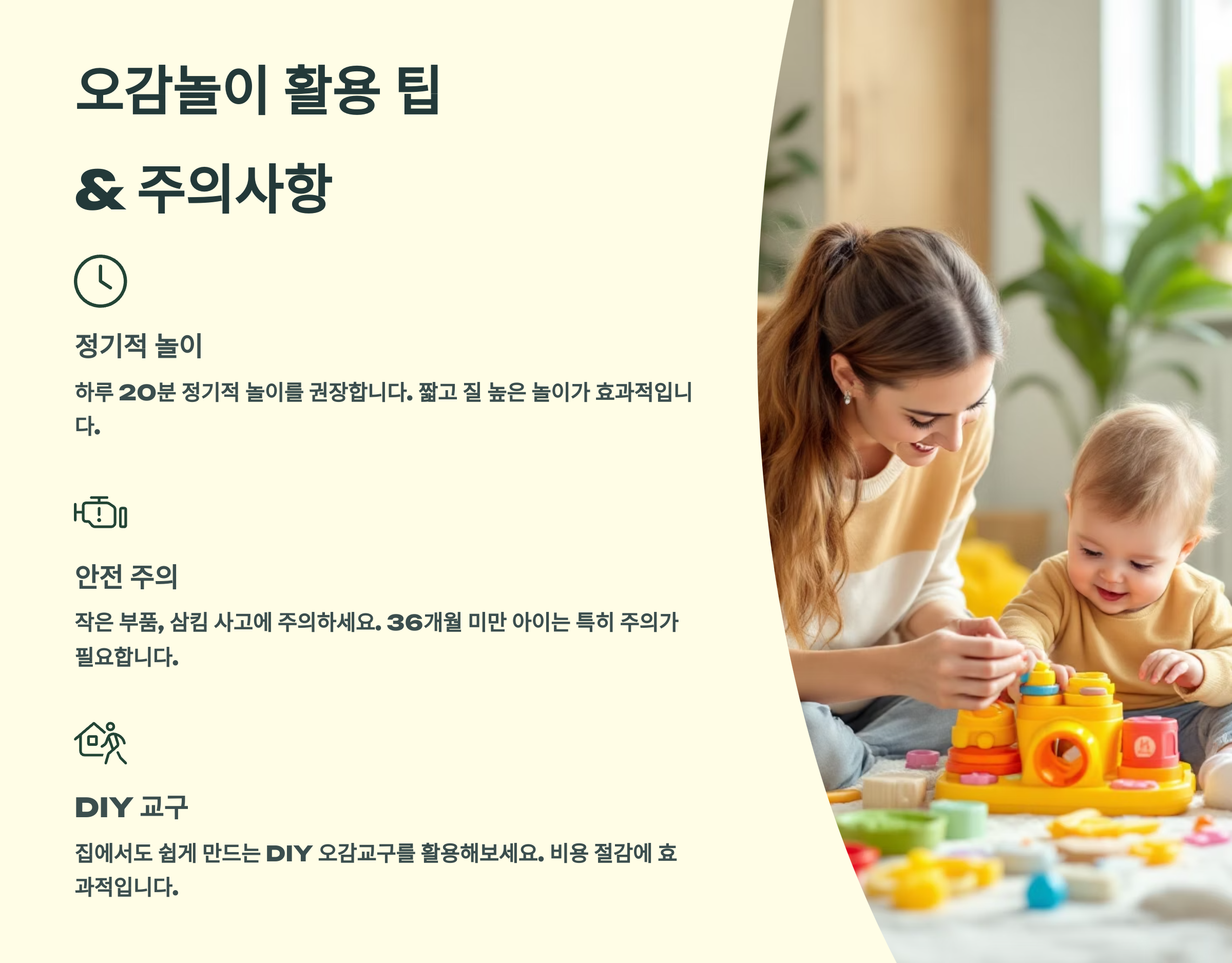 제품마다 자극 감각 수나 가격대는 차이가 있지만, 아이의 나이, 놀이 성향, 목적에 맞춰 선택한다면 어떤 교구든 충분히 의미 있는 놀이가 될 수 있어요! 😊 다음은 오감놀이를 더욱 잘 활용하는 실전 팁과 주의사항 알려드릴게요!