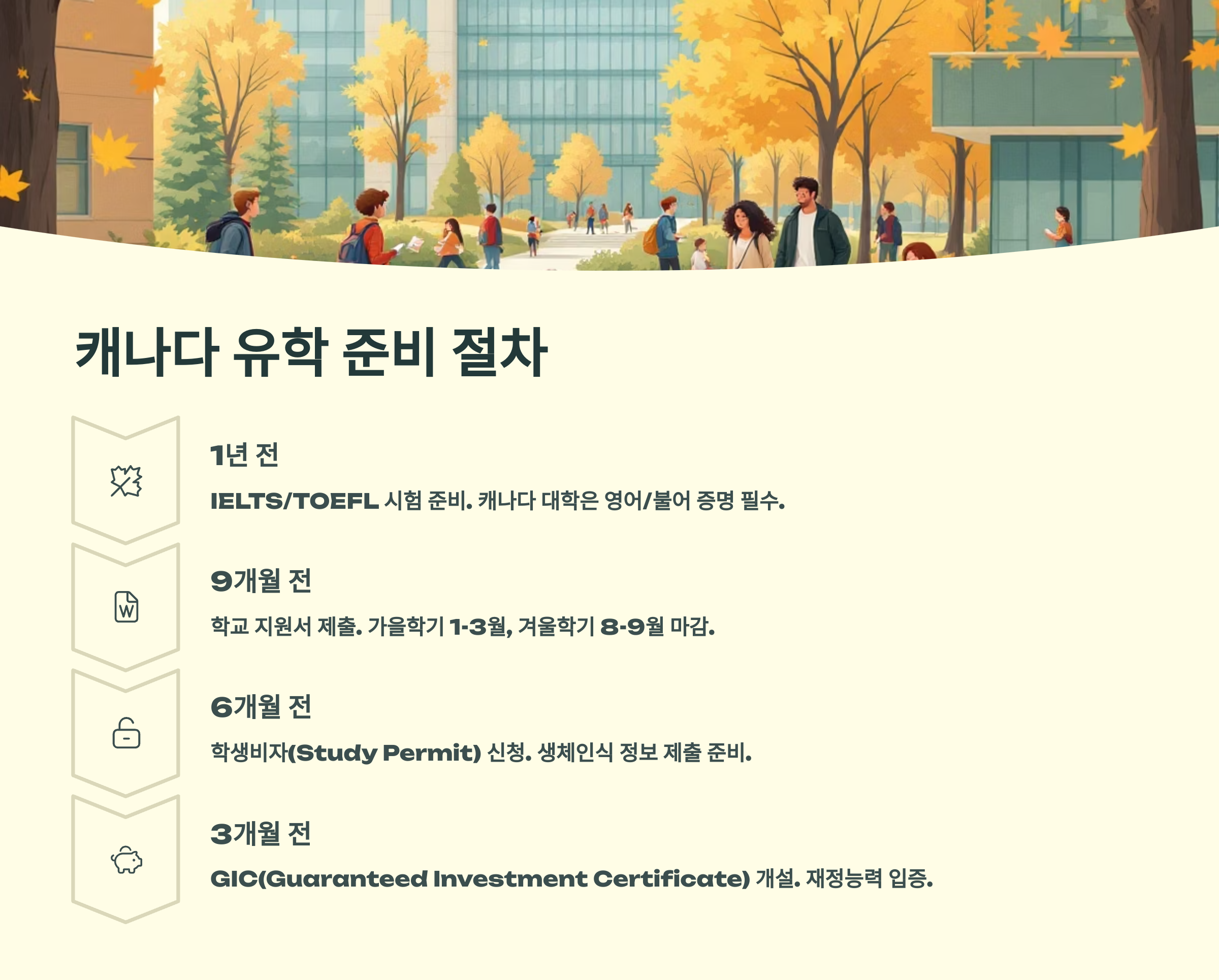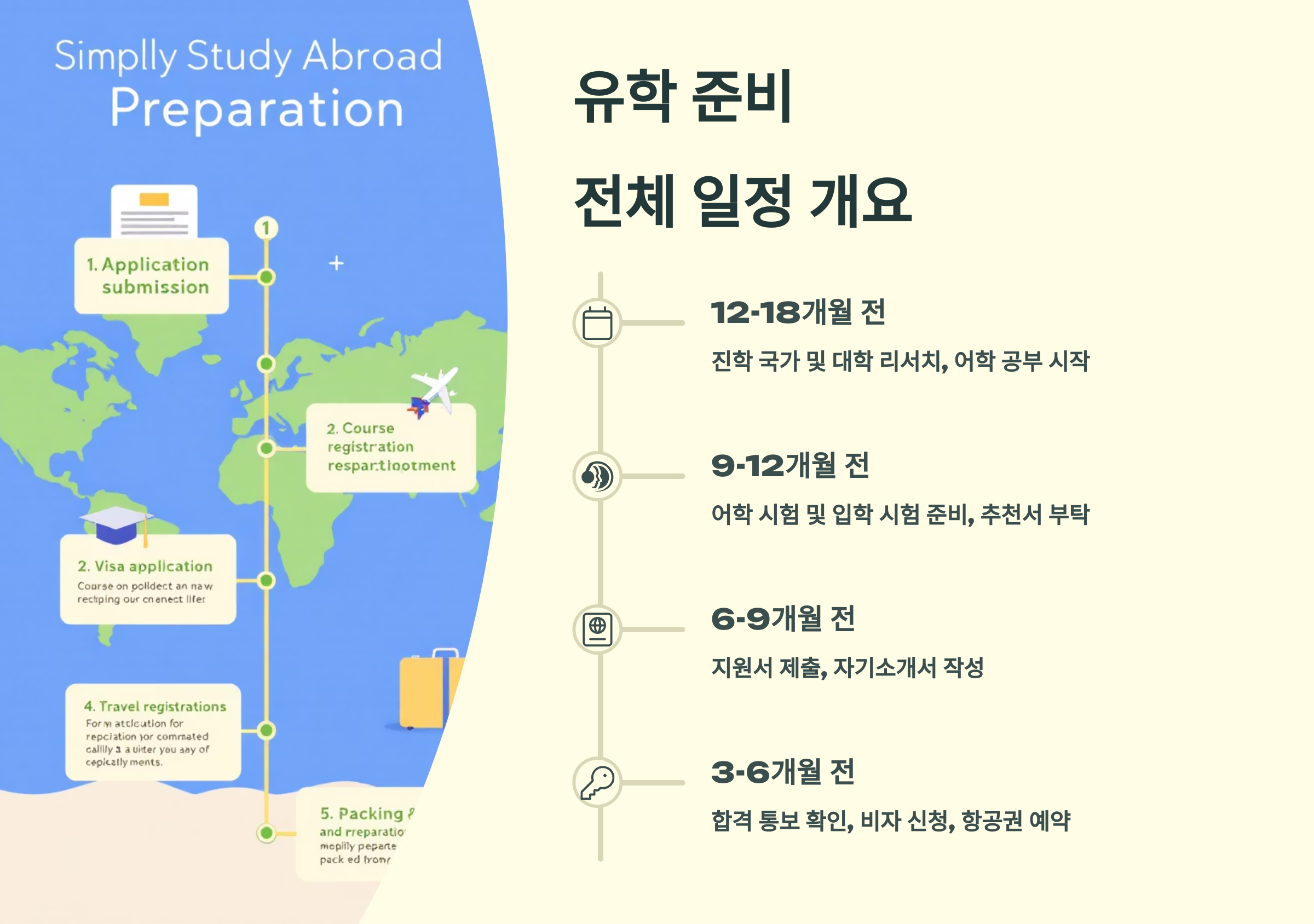 | 12~9개월 전 | 국가·전공 결정, 입시 일정 조사, 어학 시험 계획 |