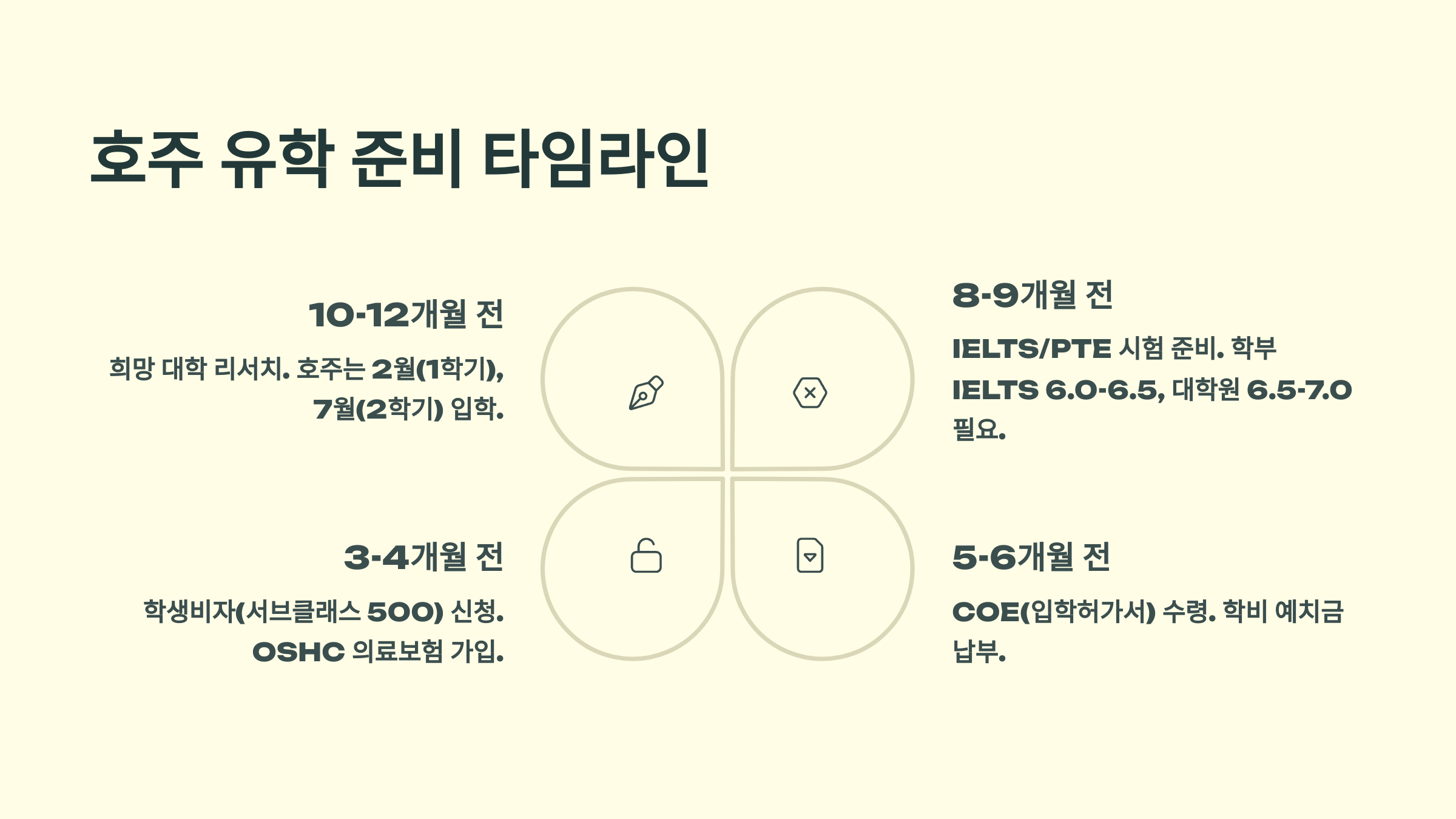 영국은 서류 퀄리티와 타이밍이 성패를 가르는 핵심이에요! 다음은 호주 유학 준비 타임라인으로 넘어가볼까요? 🇦🇺