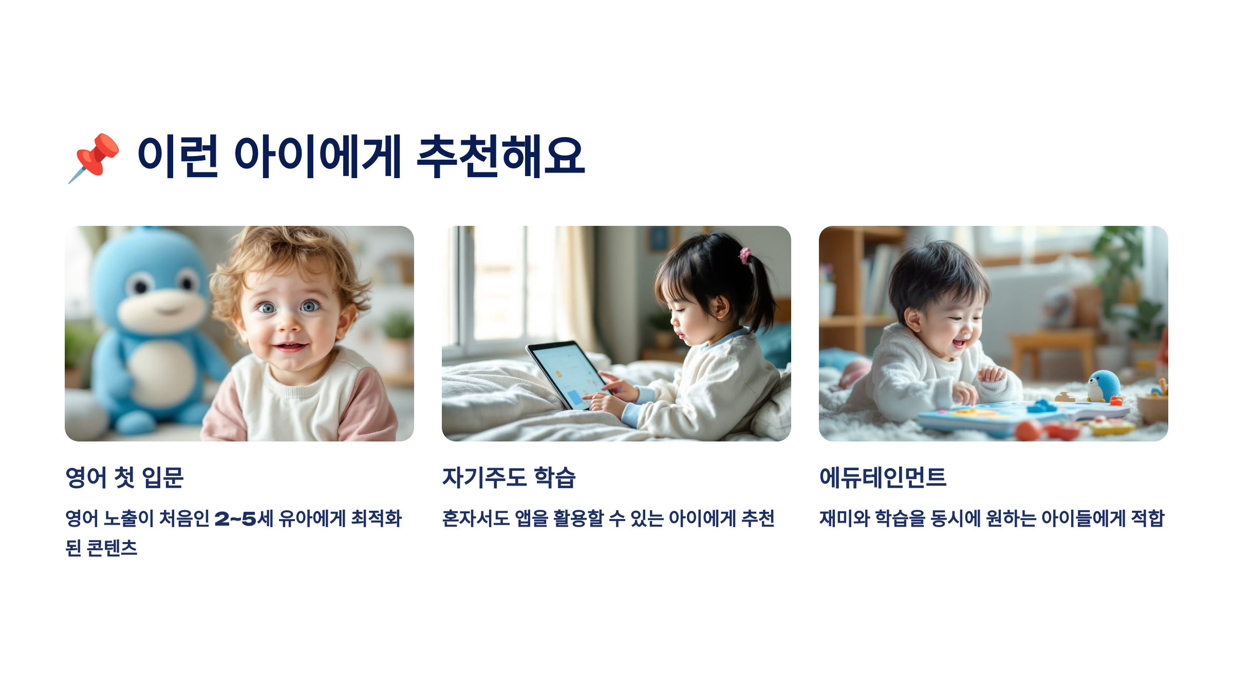 📌 모든 영어 앱이 모든 아이에게 잘 맞진 않아요. 뽀로로 잉글리시는 특정 연령대와 성향에 특히 잘 맞는다는 걸 사용해보면서 확실히 느낄 수 있었어요. 아래와 같은 아이에게 적극 추천할게요! 😊💬