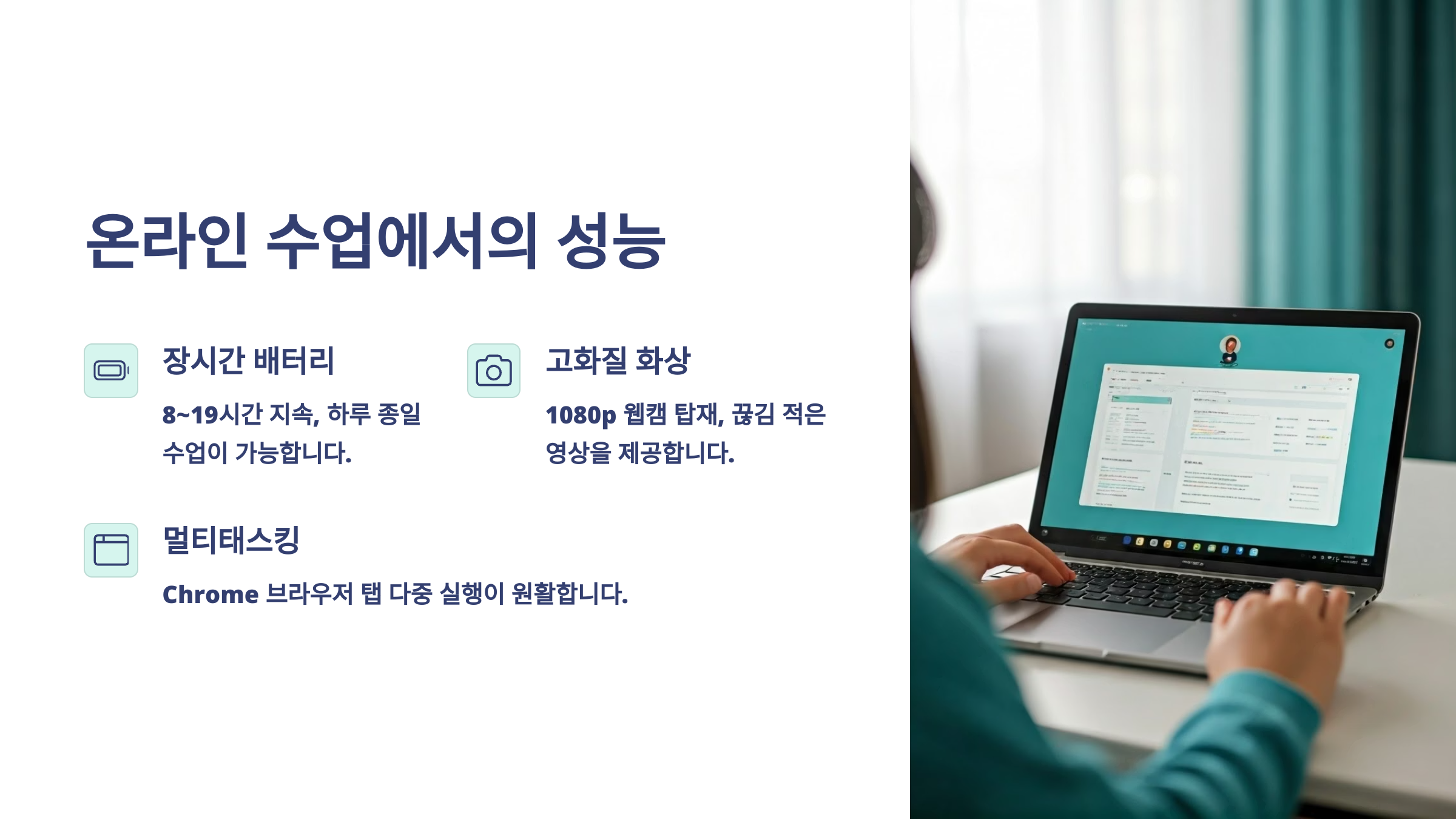 저는 크롬북에 내장된 카메라와 마이크로 수업을 들었는데, 소리도 잘 들리고, 내 말도 상대방에게 잘 전달됐어요. 특히 웹 기반이라 그런지 버벅거림 없이 깔끔하게 실행되더라고요! 🎧