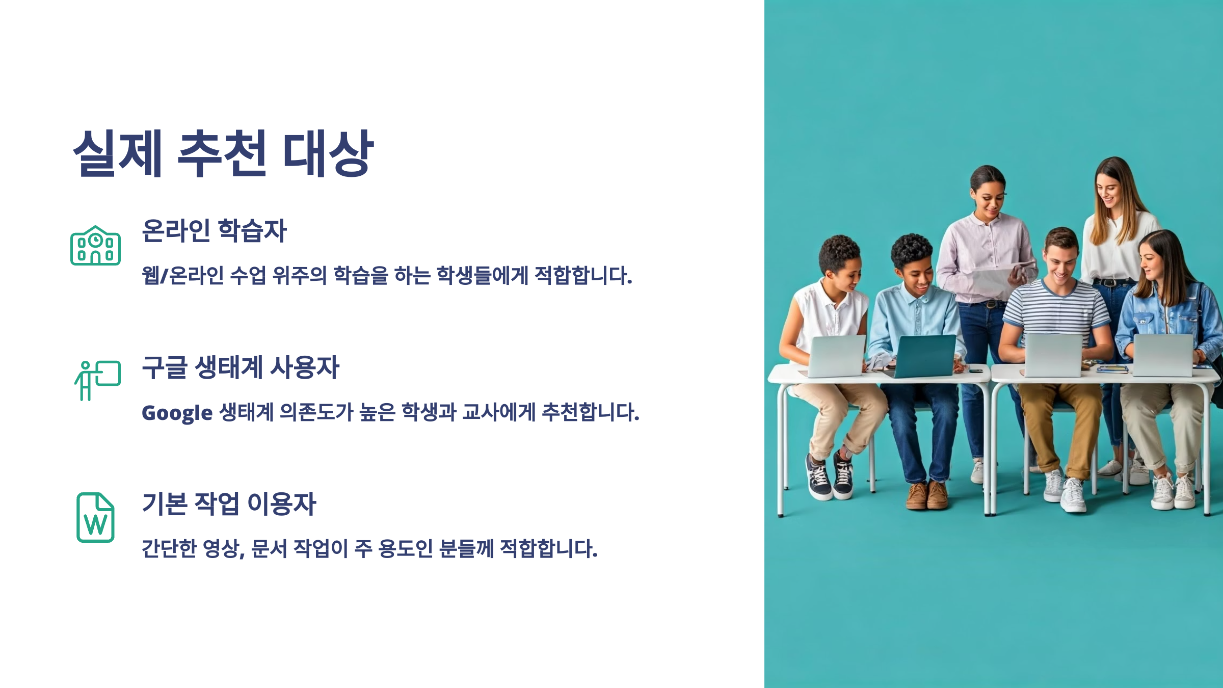 이제 크롬북이 어떤 사람에게 맞는지, 다음은 실제 추천 대상자 유형 + FAQ로 정리해줄게! 💡