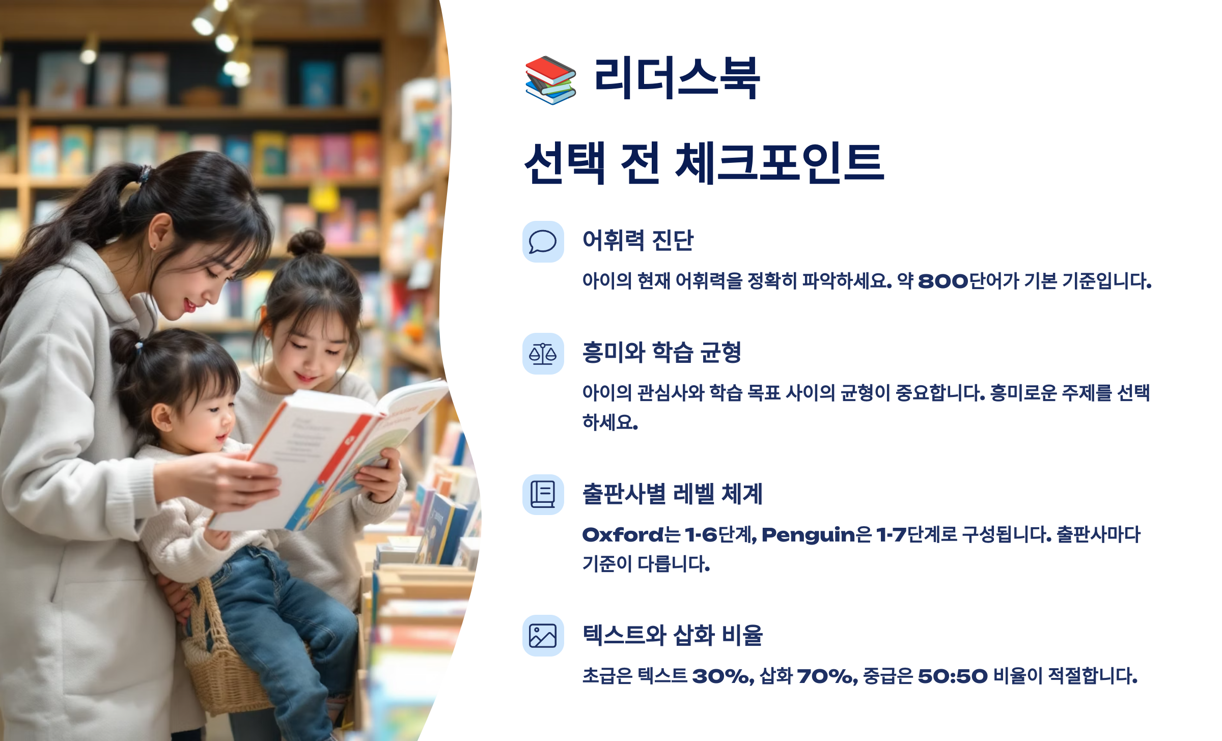 다음 섹션에서는 리더스북을 고르기 전에 꼭 확인해야 할 선택 기준과 체크포인트를 안내해드릴게요!