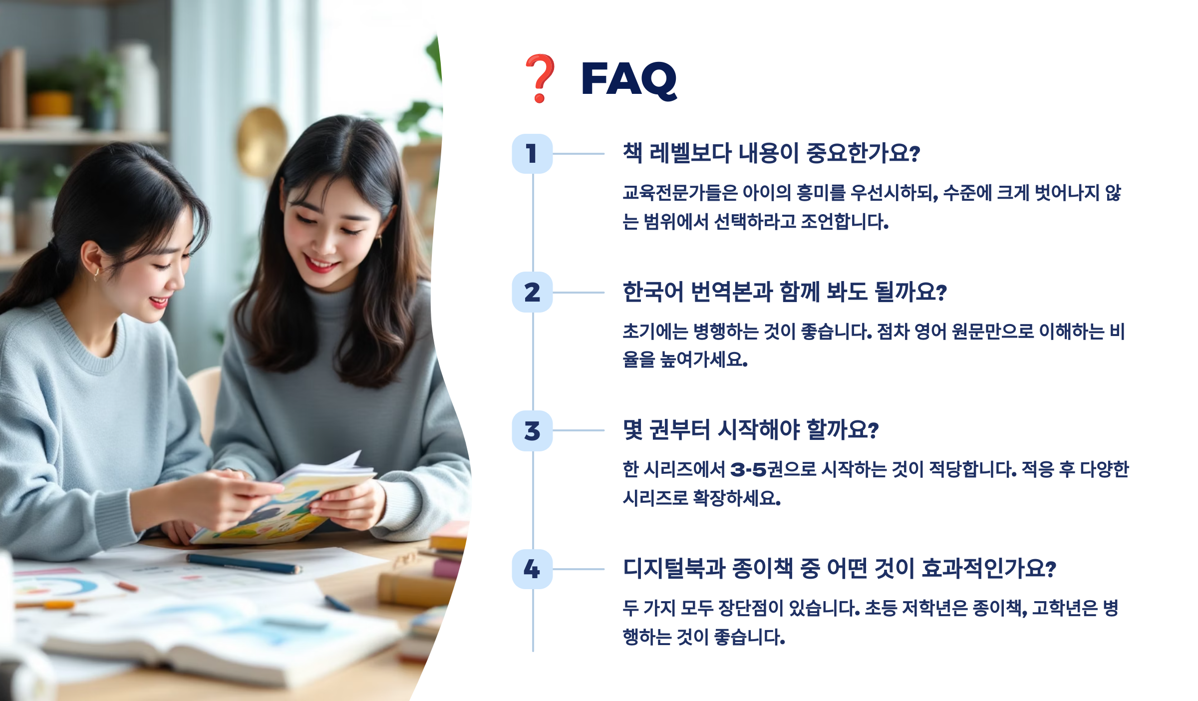 🎯 오디오는 리더스북의 핵심 도구 중 하나예요. 눈으로만 읽지 말고 귀로 듣고, 입으로 따라 말하면서 영어 리듬을 몸에 익히게 해주세요. 이제 다음은 실제 많이 궁금해하는 질문들을 모은 FAQ 코너로 이어갈게요! ❓
