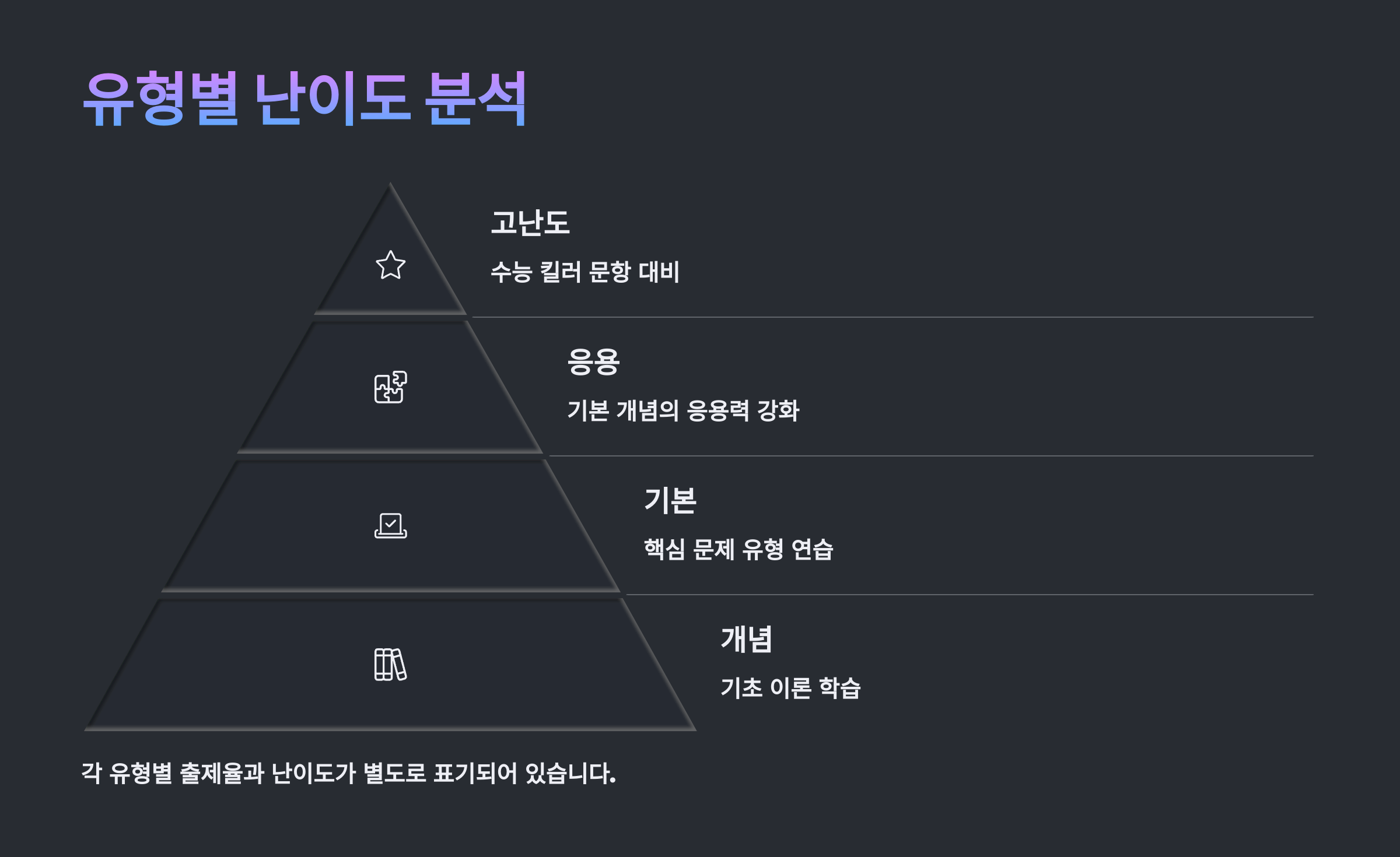 📊 다음 섹션에서는 자이스토리 수학에 수록된 문제들 중 유형별 난이도를 분석해볼게요! 어떤 유형이 가장 어렵고, 어떤 게 가장 기본인지 한눈에 알려드릴게요 😊
