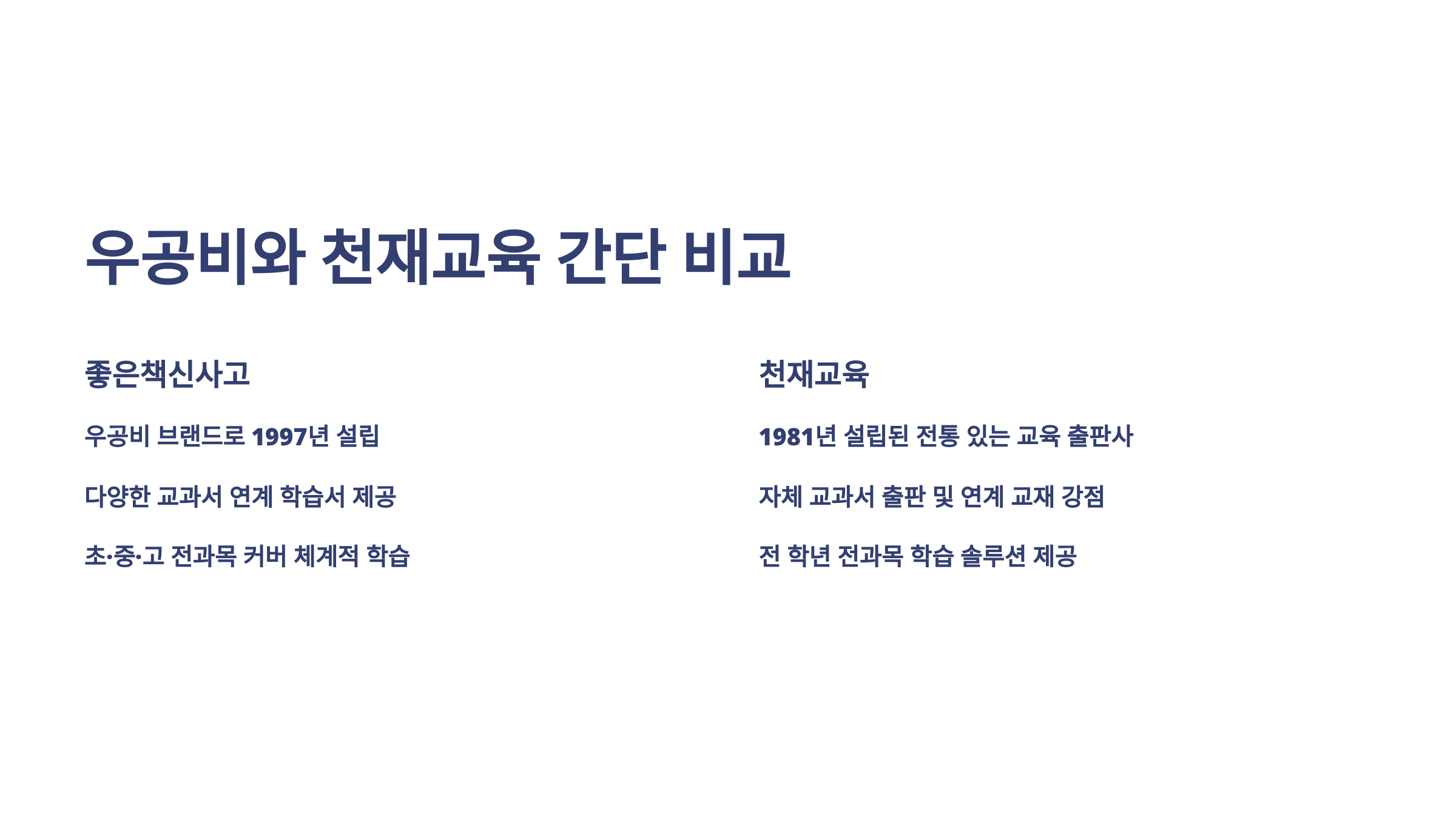 정리하면, 우공비는 시각적이고 친근한 접근이 특징이고, 천재교육은 정통적인 설명 중심이에요. 같은 내용을 다루더라도 설명 방식과 접근법이 달라서, 아이 성향에 따라 선택이 달라질 수 있어요. 🎯