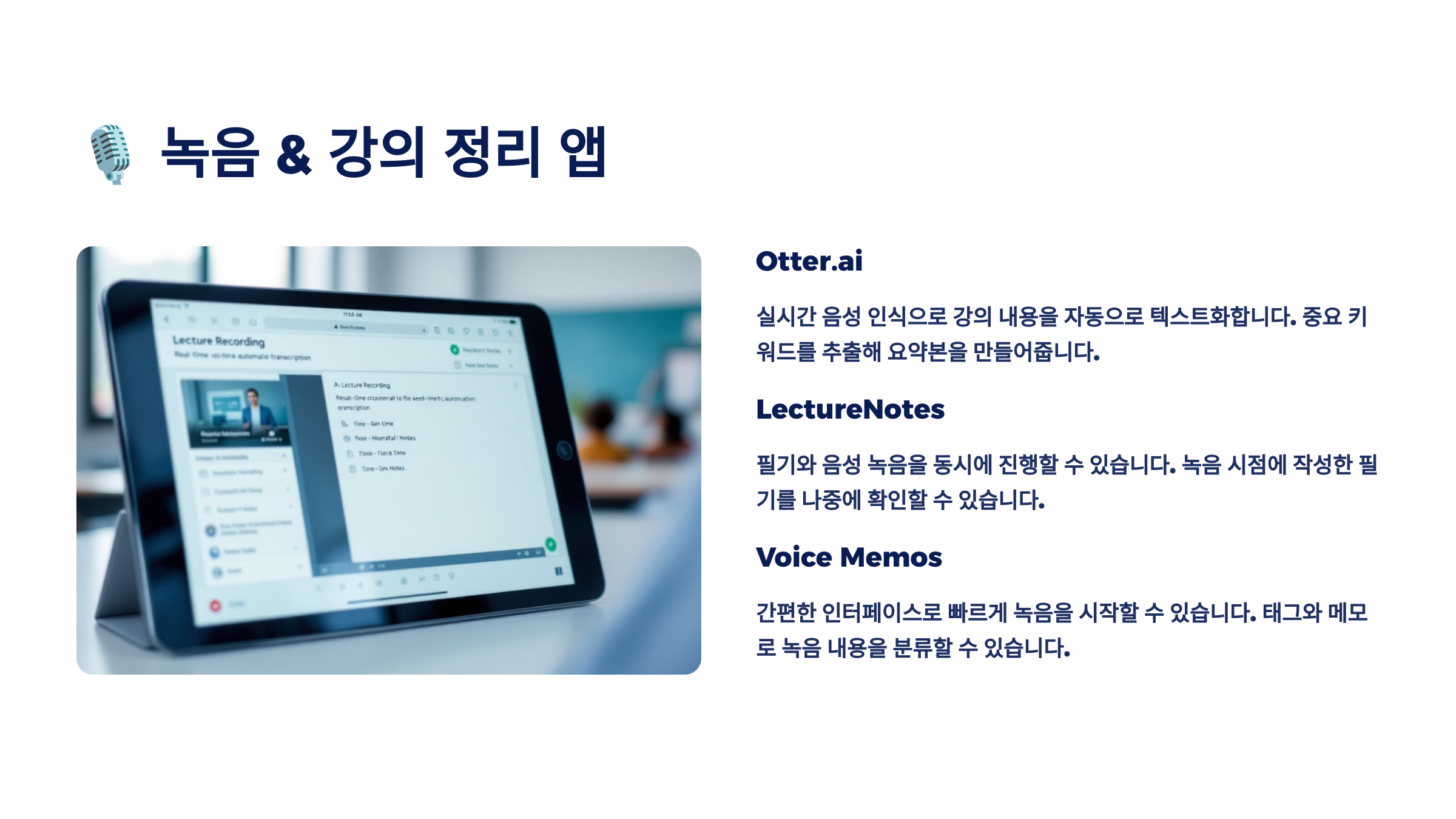 강의를 들을 때 모든 걸 다 받아적는 건 쉽지 않죠. 말은 빠르게 흘러가고, 놓친 부분은 다시 확인할 수 없으니까요. 이럴 때 녹음 기능이 있는 앱을 활용하면 완전 게임 체인저가 돼요. 나중에 놓친 부분을 다시 들으며 복습할 수 있고, 강의 내용을 구조화해서 정리할 수 있으니까요.