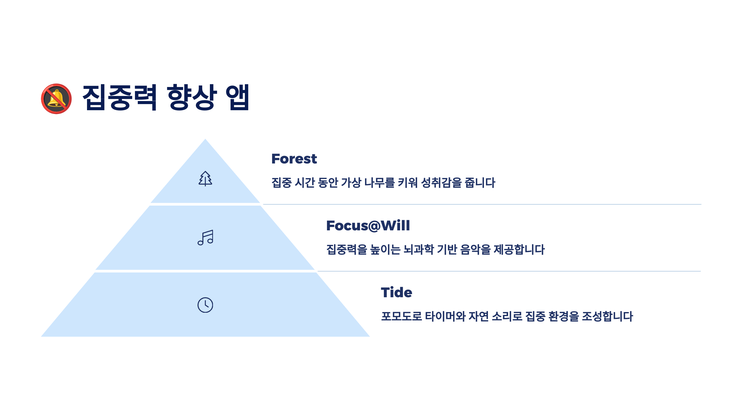 | Forest | 나무 키우기+타이머 | 게임적 요소, 귀여움 | 앱 전환 시 방해 | 즐겁게 집중하고 싶은 사람 |