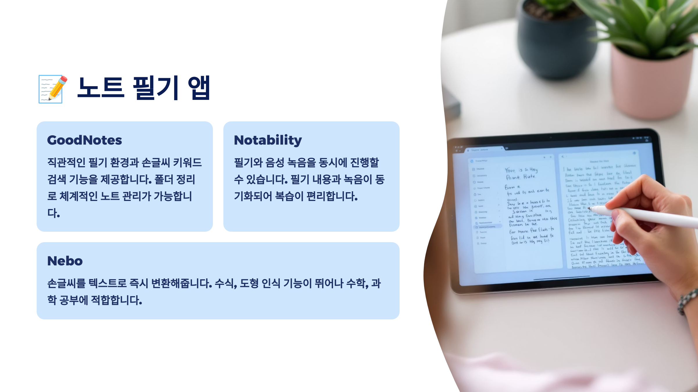 | GoodNotes | PDF 필기, 폴더 정리, 손글씨 | 종이 같은 느낌, 깔끔한 정리 | 다소 비싼 유료 | 필기 위주 학습자 |