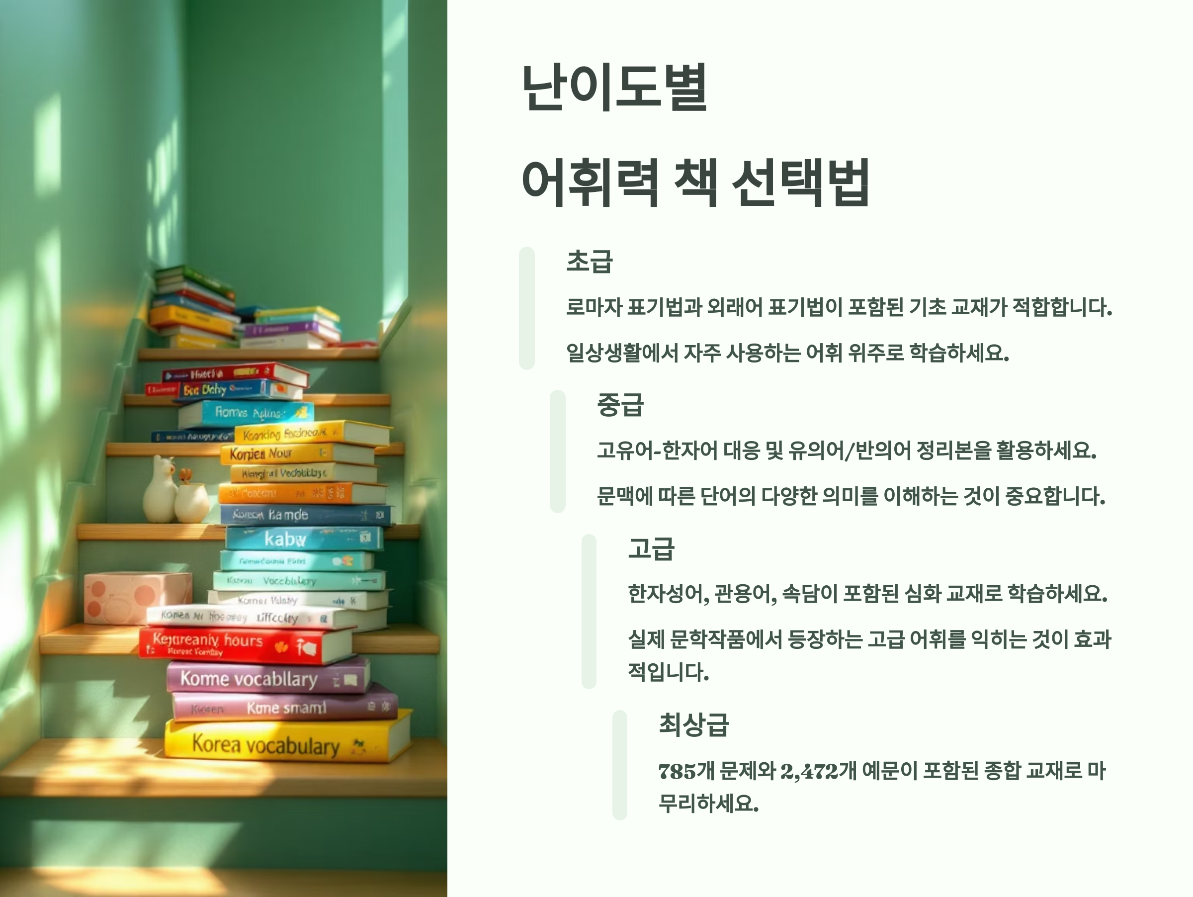 그래서 필요한 건 난이도에 따른 3단계 분류예요. 각 단계별로 어떤 출판사의 책이 맞는지, 어떤 아이에게 적합한지도 함께 설명드릴게요! 우리 아이 수준에 딱 맞게 고르면, 어휘 공부가 훨씬 쉬워져요! 📈📘