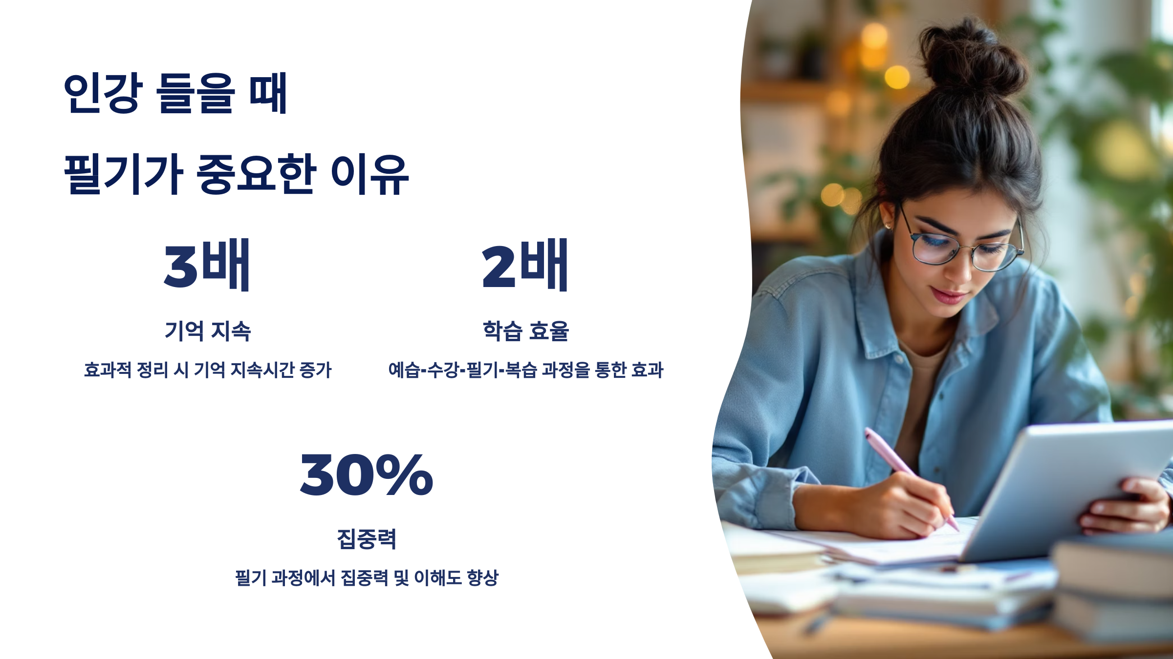 필기는 집중력 유지에도 매우 효과적이에요. 인강은 혼자 듣다 보면 딴생각 하거나, 졸릴 수 있잖아요? 그때 노트를 쓰면서 듣기만 해도 두뇌가 훨씬 활성화되고, 강의의 핵심이 머릿속에 남게 돼요. 🧠⚡