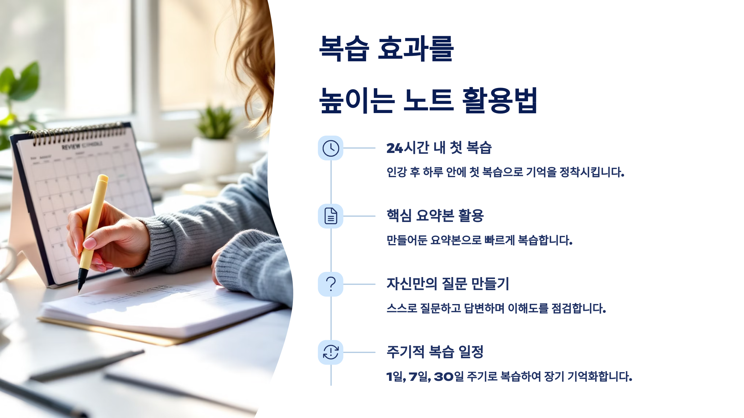 노트를 써놓고 그냥 덮어두면 아무 의미 없어요. 노트 필기의 진짜 힘은 ‘복습 루틴’에서 나와요. 강의를 한 번 듣고 정리한 내용을 계획적으로 되짚는 습관이 성적 향상에 가장 큰 영향을 준답니다! 📘🧠