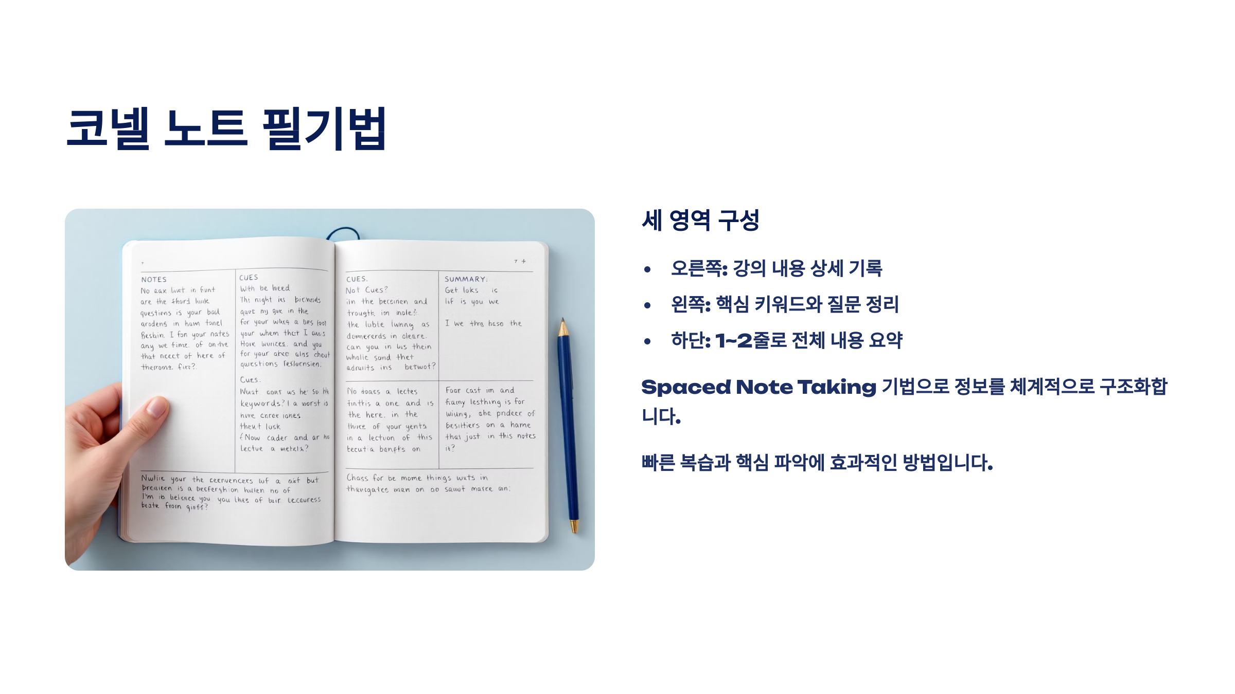 이 필기법은 특히 복습과 자기 테스트에 강해요. 나중에 왼쪽만 보면서 내용을 떠올려보는 퀴즈 복습이 가능하거든요. 그래서 단순 정리용이 아니라 기억 강화용 노트로도 활용돼요. 💭🧠