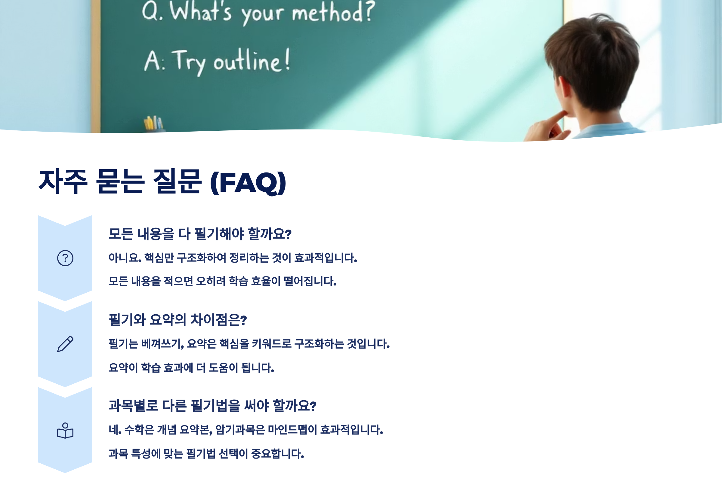 A7. 줄이세요! 전체를 적는 것보다 ‘선별해서 적는 것’이 더 중요해요. 핵심 용어, 공식, 틀리기 쉬운 포인트만 추려서 기록하세요. 🧠
