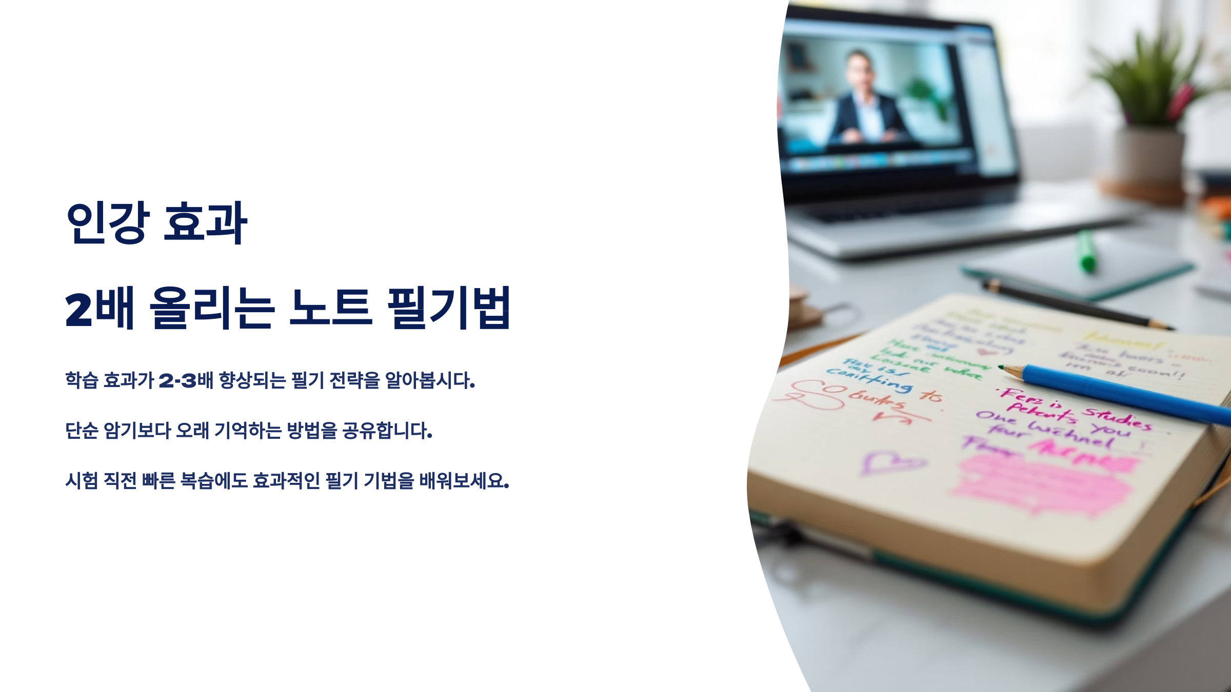 즉, 인강 필기는 '기억의 외장하드'이자 '나만의 교과서'예요. 잘 쓰면 공부 시간을 줄여주고, 정리 실력을 키워주고, 학습 효율을 극대화해줘요. 이제 어떻게 써야 더 잘 정리할 수 있을지 알아볼까요? 😊