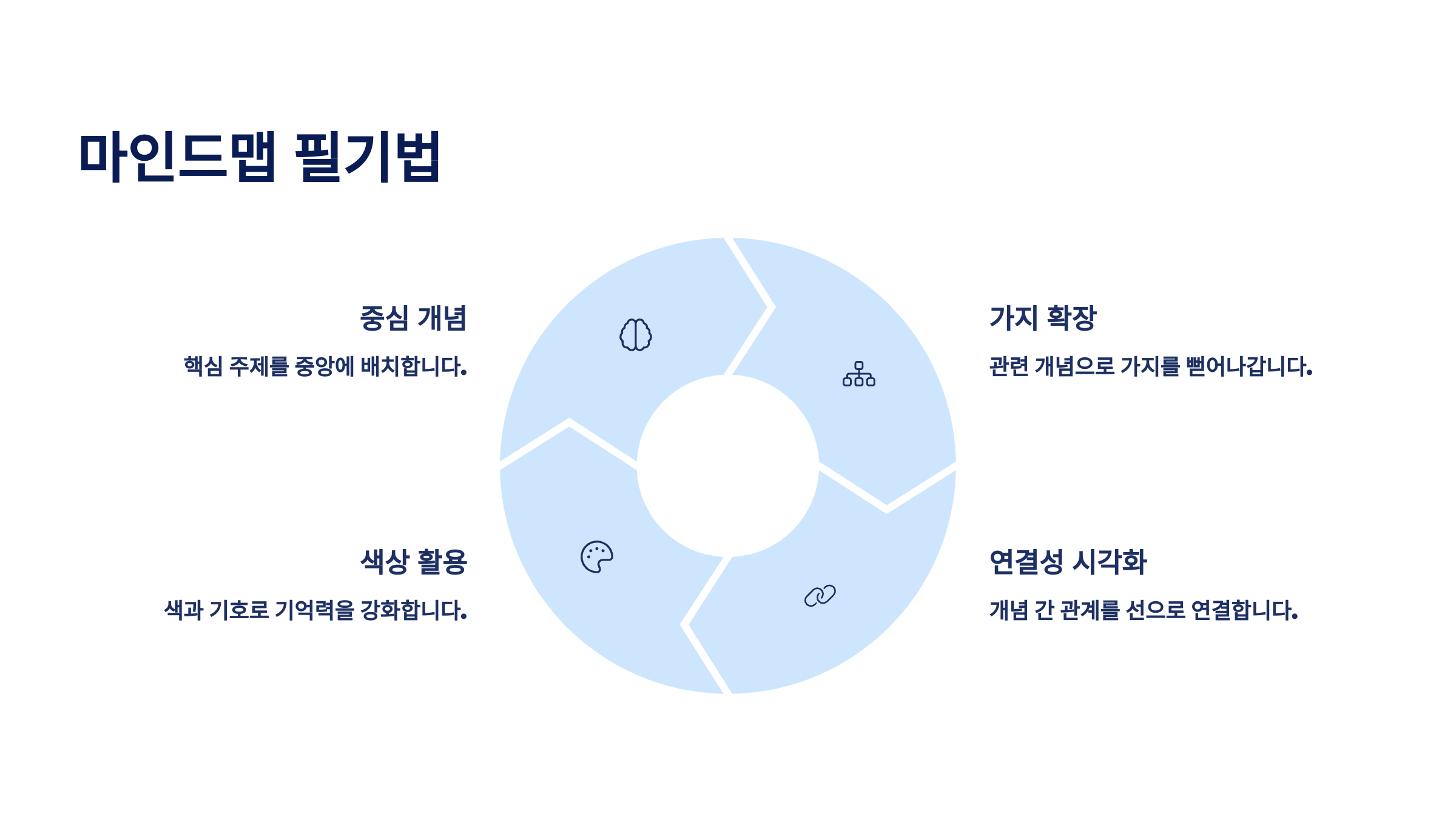 이 다섯 가지 원칙만 기억해도 필기 퀄리티가 안정적으로 올라가요. 다음은 구체적인 필기법 예시들을 알아볼게요. 마인드맵 필기부터 시작합니다! 🧠📌