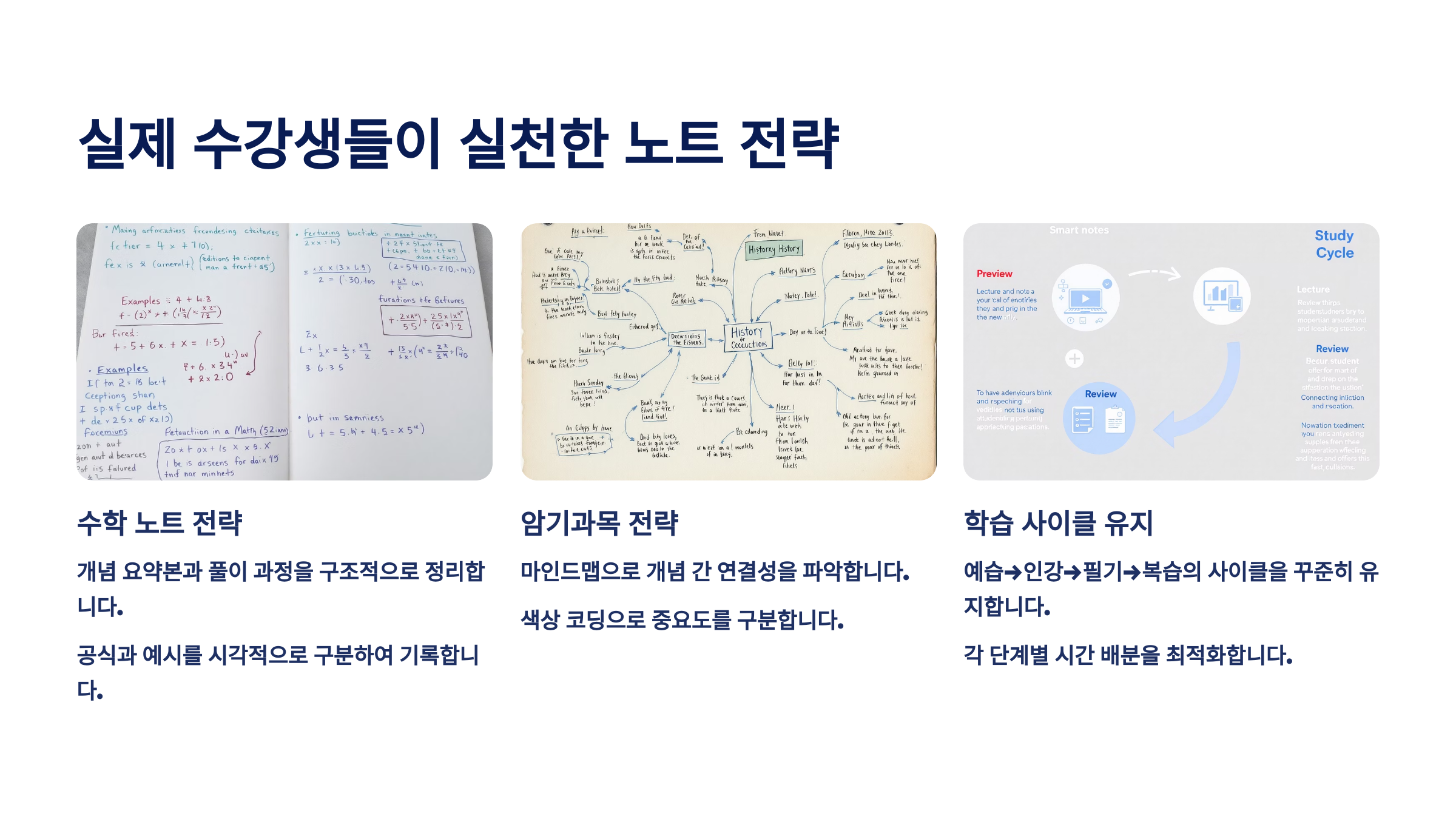 노트는 잘 쓰는 것도 중요하지만, 계획적으로 복습해야 진짜 내 것이 돼요. 다음은 실제 수강생들이 실천한 필기 전략들을 소개할게요! 😊📓