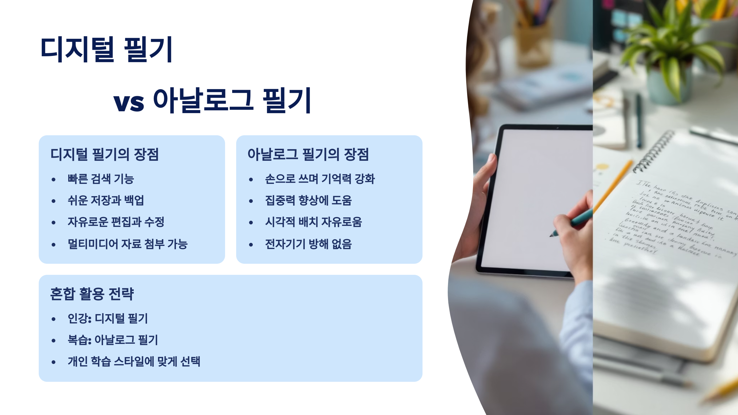 정답은 없어요! 중요한 건 상황에 맞게 선택하는 유연함이에요. 이해가 필요한 과목은 아날로그, 암기 과목은 디지털처럼 혼합해서 활용해보세요. 😉📒💻