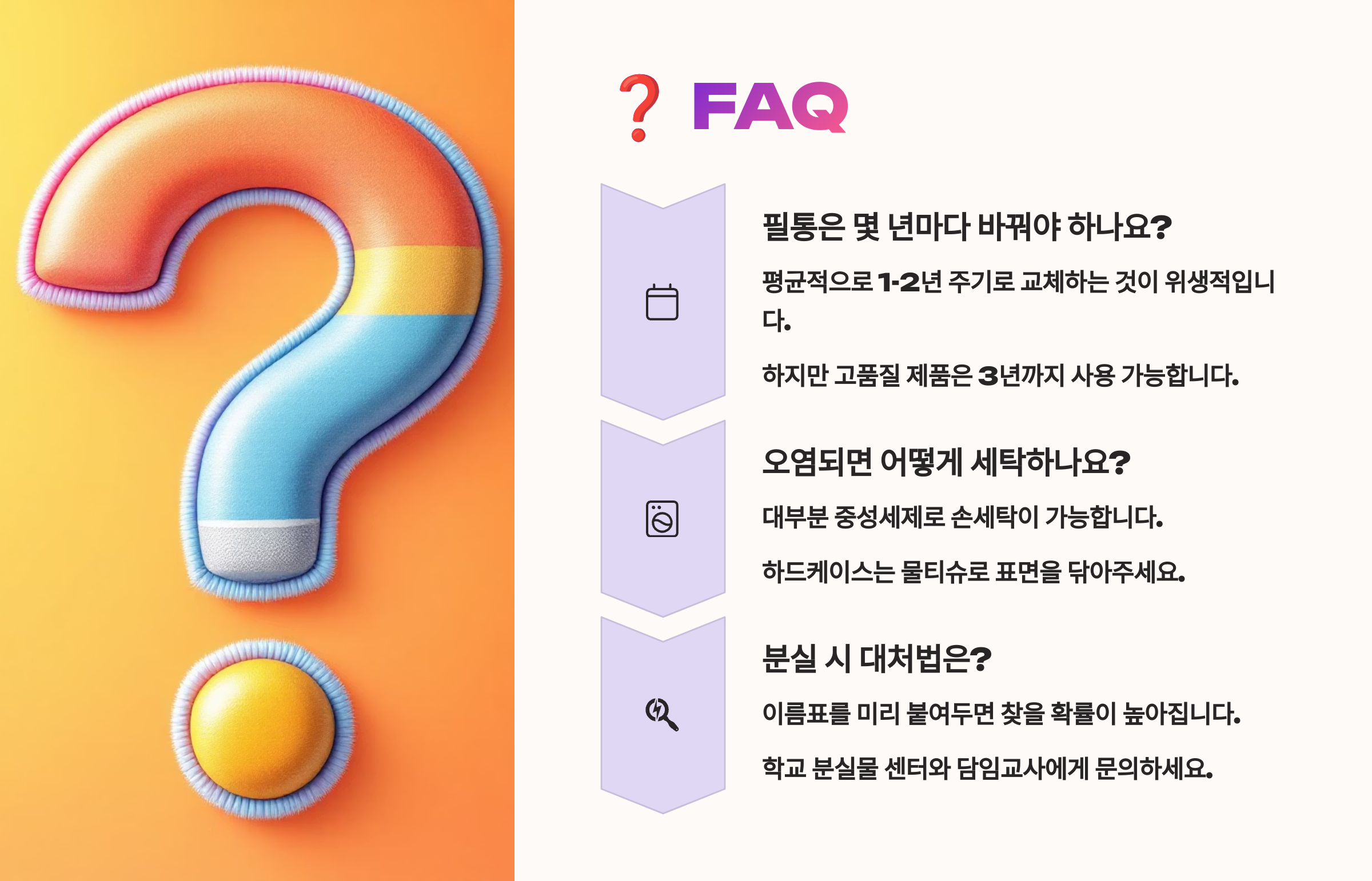 필통은 ‘한 번 사면 오래 쓰는 도구’예요. 1학기 내내, 혹은 1년 이상 쓰는 경우도 많기 때문에 기능·디자인뿐 아니라 내구성과 위생성까지 체크하는 게 중요해요! 🧼💪