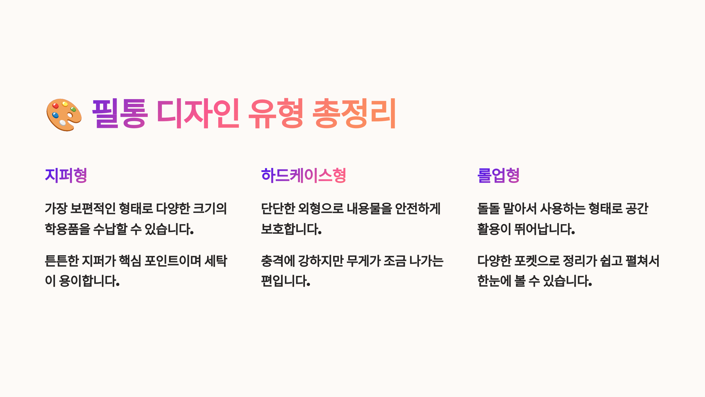 결론은, 필통은 작지만 절대 가볍게 봐선 안 되는 필수템이에요. 아이의 학년, 성향, 생활 습관에 맞는 필통을 잘 선택하는 것, 그게 바로 학습의 첫 단추를 제대로 끼우는 일이에요! 👦👧✏️
