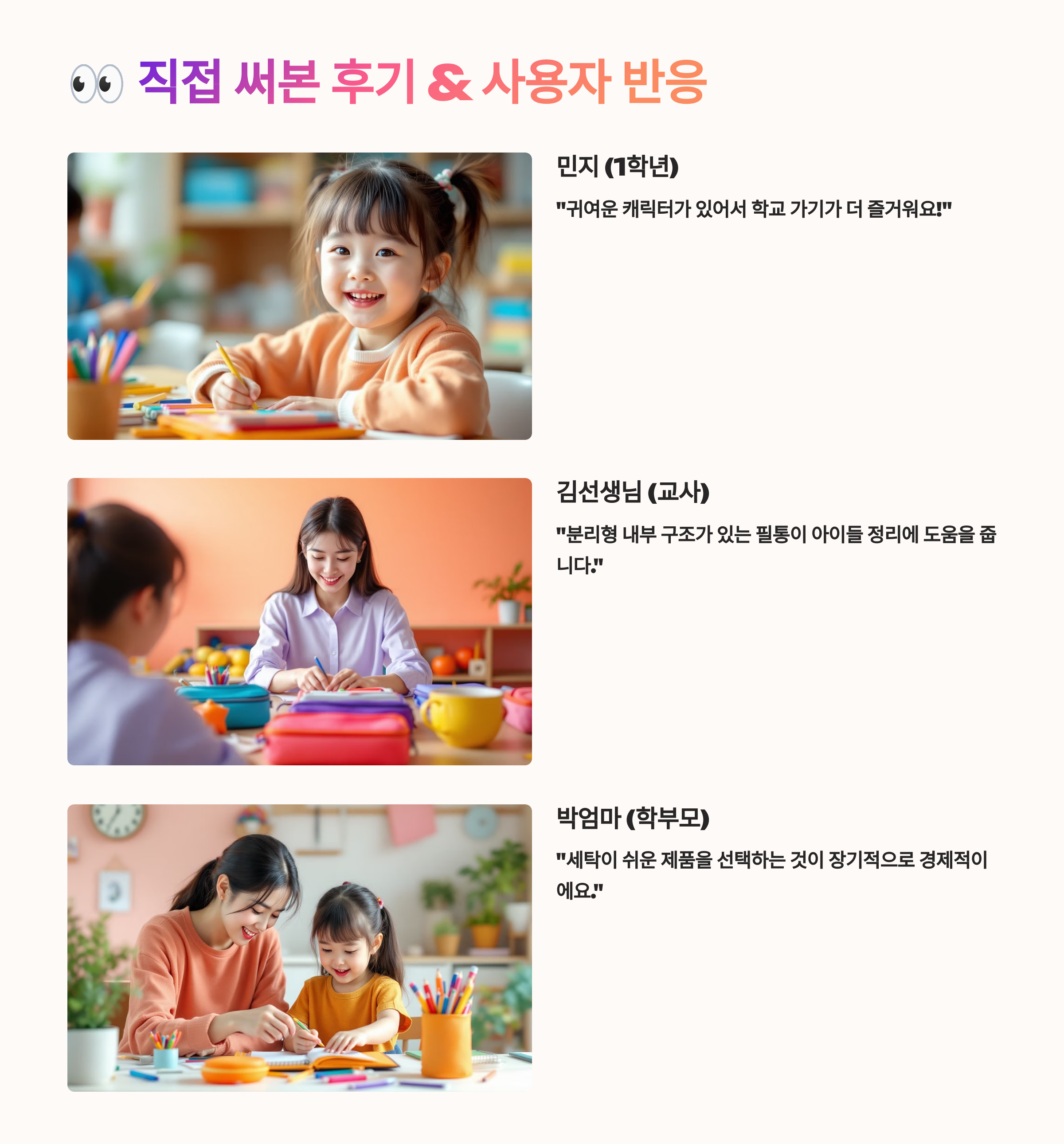 | 스누피 | 지퍼 부드럽고, 수납 넉넉함 | 3~4학년 여아 부모 |