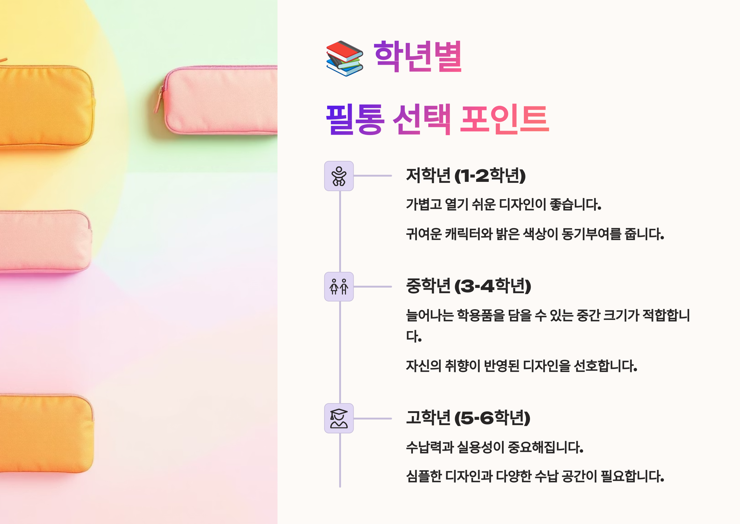 아이마다 성향은 다르지만 학년에 맞는 필통 구조를 고르는 건 매우 실용적인 팁이에요. 1학년부터 6학년까지, 지금 우리 아이에게 맞는 단계별 선택이 중요해요! 📐✂️