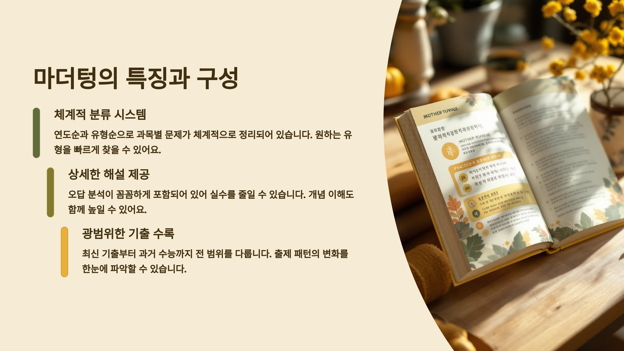 ✅ 다음 섹션에서는 많은 수험생들이 선택하는 마더텅의 특징과 구성에 대해 자세히 알려줄게요! 어떤 과목이 특히 강한지, 해설은 어떤 스타일인지 함께 알아봐요.