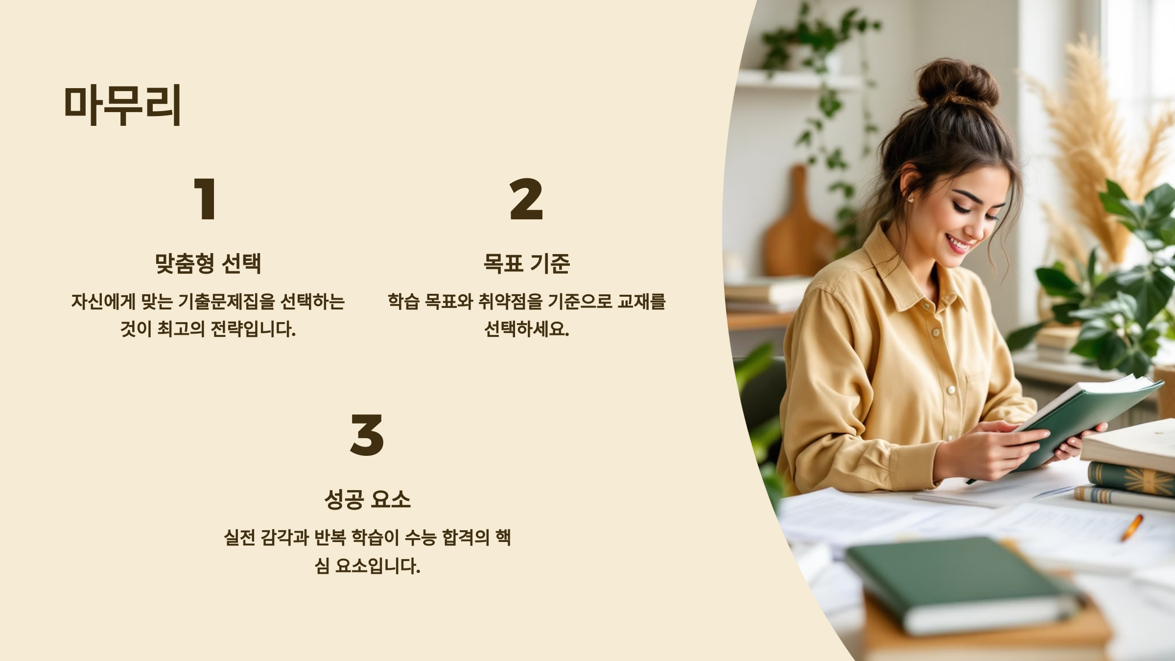 📌 중요한 건 문제집 자체가 아니라, 문제집을 활용하는 나만의 방식이에요. 문제를 많이 푸는 것도 좋지만, 하나의 문제를 얼마나 깊이 있게 파악하고, 다시 보며 내 것으로 만들 수 있는지가 진짜 실력이에요.