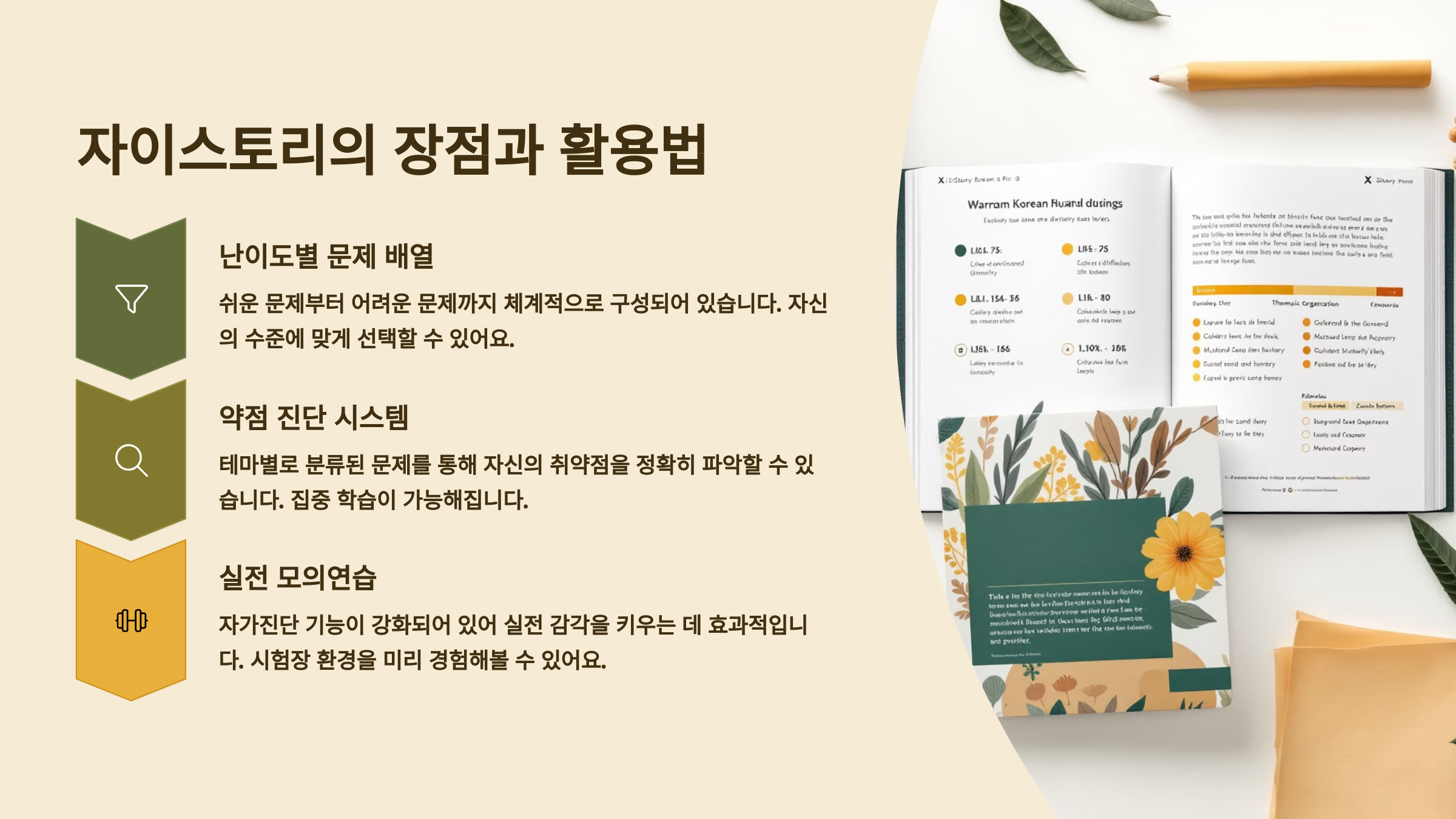 🎯 반면, 기출의 흐름을 시간 순서로 보며 파악하고 싶은 학생에게는 오히려 부담이 될 수 있어요. 그래서 자이스토리는 ‘심화용’으로 적합하고, 이미 기출을 한 바퀴 돈 학생들이 2회독용으로 활용하면 효과적이에요!